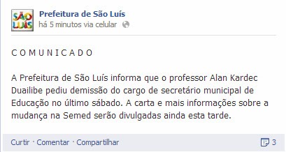 | A Prefeitura de São Luís acabou de comunicar através de sua fan page na rede social Facebook, que o ex-secretário municipal de Educação, Allan Kardec, foi quem pediu exoneração do cargo. Segundo informações, ele renunciou ao cargo, entregando uma carta ao prefeito Edivaldo Holanda Júnior (PTC) e que a mesma será divulgada nesta tarde de segunda-feira (28), além do nome do substituto. Se a carta foi entregue desde sábado (26), por qual motivo ela não é logo divulgada? |